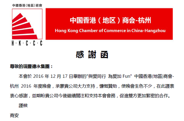 12月22日,瑞豐德永收到了一封來至于中國香港(地區(qū))商會(huì)-杭州的感謝信,在此也對(duì)中國香港(地區(qū))商會(huì)-杭州對(duì)瑞豐德永的支持與信任表示衷心的感謝。未來雙方將繼續(xù)攜手為內(nèi)地企業(yè)和個(gè)人“走出去”提供更全面專業(yè)的服務(wù),為助力中港聯(lián)動(dòng)發(fā)揮更大的作用。
