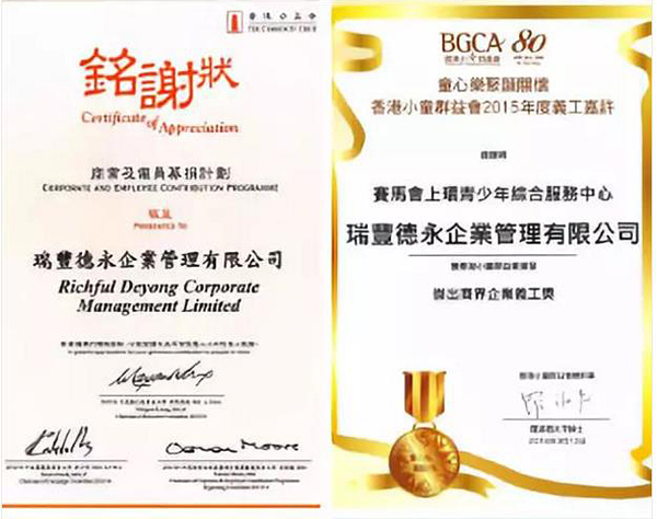? 榮獲香港公益金頒發(fā)的銘謝狀