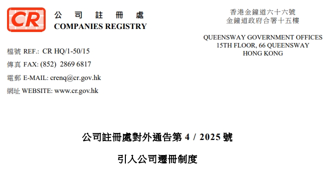 《公司條例》(第622章)已作出修訂,引入新的公司遷冊制度,讓非香港法團遷冊來港。在《2025年公司(修訂)(第2號)條例》(下稱《修訂條例》)內(nèi)的相關法例修訂,已于2025年5月23日實施。