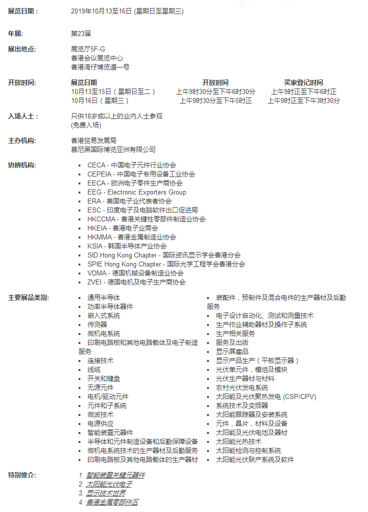 國際電子組件及生產(chǎn)技術(shù)展2019為供應(yīng)商創(chuàng)造一個高效環(huán)境,與來自全球電子行業(yè)買家作更緊密的聯(lián)系。2018年,國際電子組件及生產(chǎn)技術(shù)展與香港貿(mào)發(fā)局香港秋季電子產(chǎn)品占組成了全球最大電子平臺,吸引來自139個國家和地區(qū),近87000名買家進場參觀洽商。