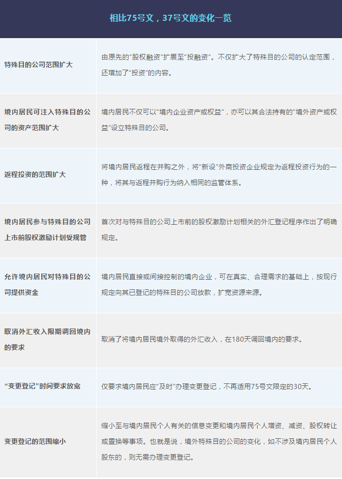 37號文在監(jiān)管范圍、特殊目的公司范圍、境內(nèi)居民境外投資、融資以及返程投資、股權(quán)激勵計劃登記、各項登記程序、處罰依據(jù)與措施等方面均進行了較大調(diào)整。