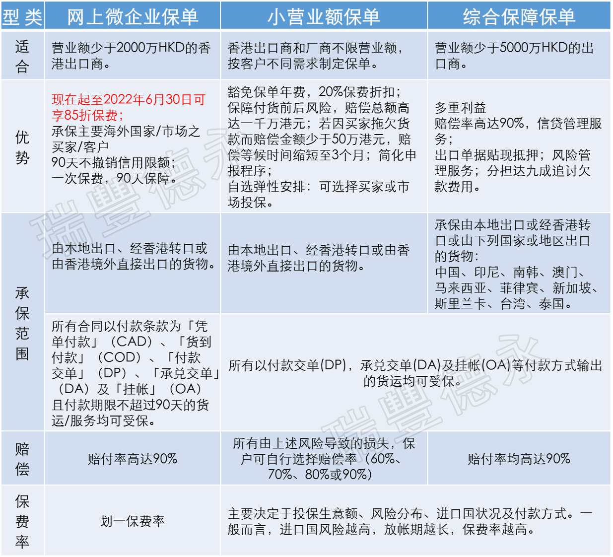 在全球此經(jīng)濟(jì)大背景下,涉及以上出口相關(guān)業(yè)務(wù)的您,應(yīng)與專業(yè)人士及時了解出口信用保險,建議盡早配置,以規(guī)避風(fēng)險、減少損失。此外,瑞豐德永在此特意提醒您,我們可為客戶提供「免費(fèi)信用評估」服務(wù)(信用額度是香港信保局在指定期內(nèi)就該買家/客戶可能承擔(dān)的最高損失數(shù)額),為您獲取香港出口信用保險局出具的信用評估報告。