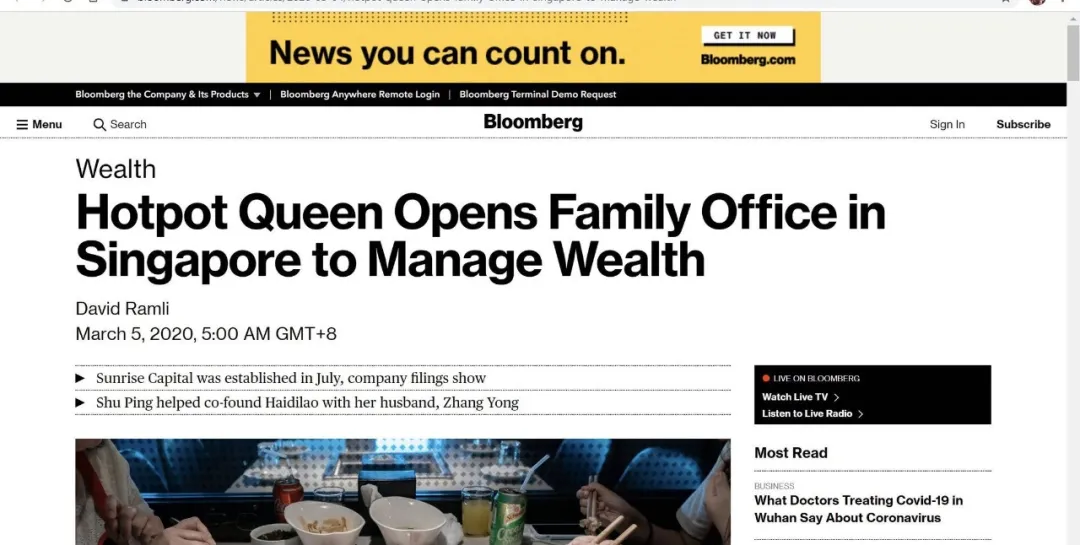 2020年3月5日彭博社Bloomberg在財富專欄的一篇報導《火鍋女王在新加坡設立家族辦公室以管理財富》,迅速將全球最大的火鍋連鎖店海底撈送上了熱搜。