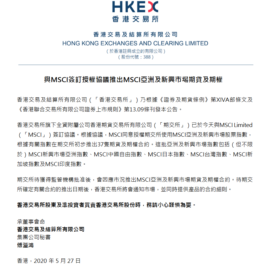 5月27日,港交所與MSCI簽訂協(xié)議,獲得未來10年授權(quán)在香港推出系列MSCI亞洲和新興市場指數(shù)的期貨及期權(quán)產(chǎn)品。根據(jù)協(xié)議,MSCI同意授權(quán)期交所使用MSCI亞洲及新興市場股票指數(shù),根據(jù)有關(guān)指數(shù)在期交所初步推出37只期貨及期權(quán)合約。