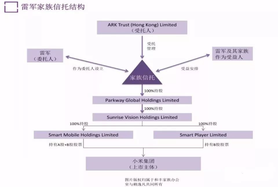 GlobalHoldings,第五層為家族信托,雷軍作為委托人,本人及其家族作為受益人;第六層為受托人方舟信托(香港)有限責(zé)任【ARK Trust(HK)Co.,Ltd】公司。方舟信托是諾亞控股集團(tuán)旗下境外全資子公司,成立于2014年12月。