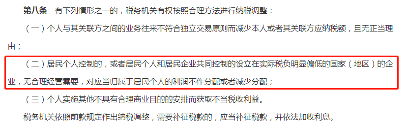 以上新個(gè)稅法第八條(二)明確:對(duì)于中國(guó)個(gè)人直接持有“離岸殼公司”,無(wú)合理需要故意不分配利潤(rùn)(或少分配),稅局可以直接調(diào)整征稅。