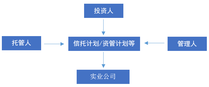 契約型架構(gòu)中的持股平臺(tái)信托計(jì)劃、資管計(jì)劃等均是由投資人(委托者)、受托者(管理人)、托管人三方構(gòu)成,如下圖所示: