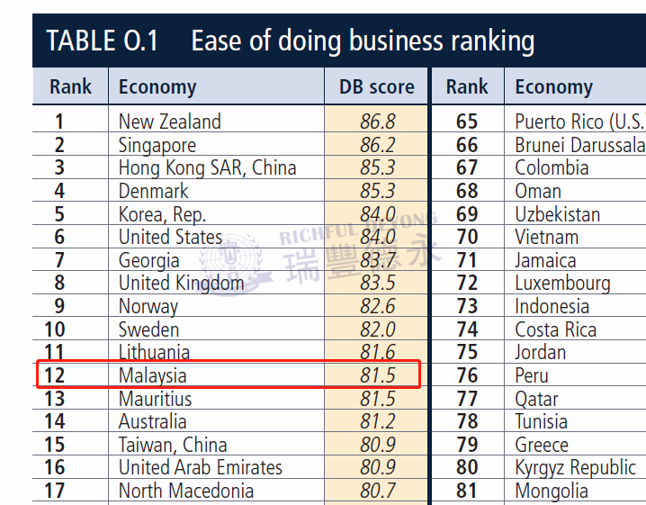根據(jù)世界銀行《2020年全球營(yíng)商環(huán)境報(bào)告》(Doing Business 2020)顯示,馬來(lái)西亞營(yíng)商環(huán)境在全球190個(gè)經(jīng)濟(jì)體中排名較去年上升3位,列第12位,在東盟地區(qū)僅次于新加坡。