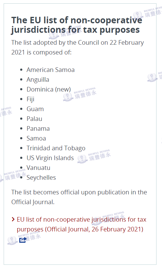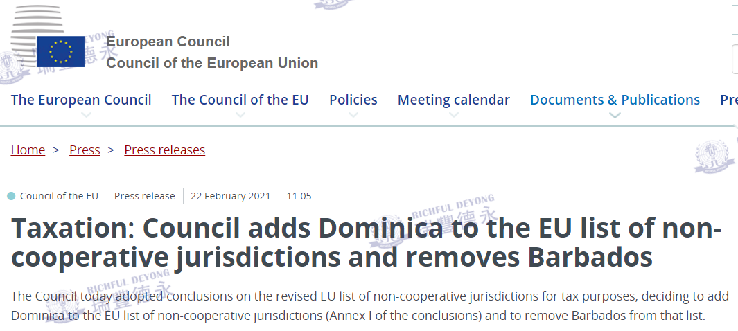 2021年2月22日,歐盟理事會在其官網上發(fā)布一則公告:就經修訂的「出于稅收目的的歐盟非合作管轄區(qū)清單」(俗稱“黑名單”)通過了結論,歐盟決定將多米尼加(Dominica)加入該名單中,同時將巴巴多斯(Barbados)移出“黑名單”。