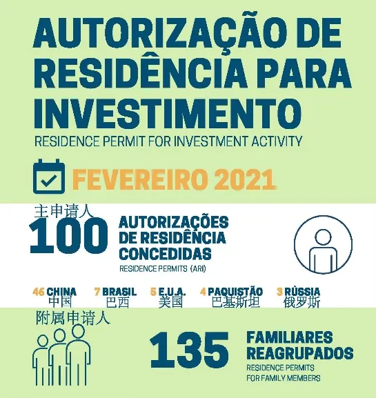 根據(jù)葡萄牙移民局(SEF)發(fā)布了2021年2月分黃金居留許可數(shù)據(jù),2月份葡萄牙SEF向235位申請(qǐng)者(100位投資人+135位家屬)授予了黃金居留許可,相比2021年1月份獲批的135位申請(qǐng)者(55位投資人+80位家屬)環(huán)比增長了82%。