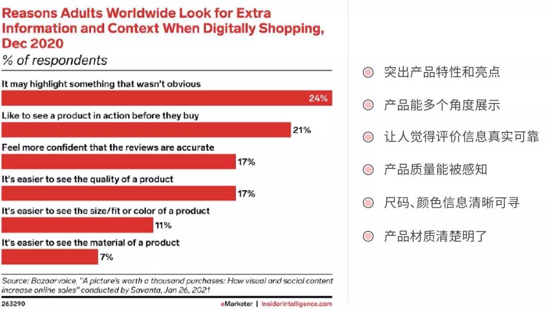 此外,營銷內(nèi)容也很重要。調(diào)研公司 bazaarvoice 在調(diào)研報(bào)告中指出,在過去的 2020 年,全球范圍內(nèi)電商用戶在網(wǎng)上購物過程中希望獲取到更多的信息和視覺體驗(yàn),以下幾個(gè)點(diǎn)可以特別關(guān)注一下: