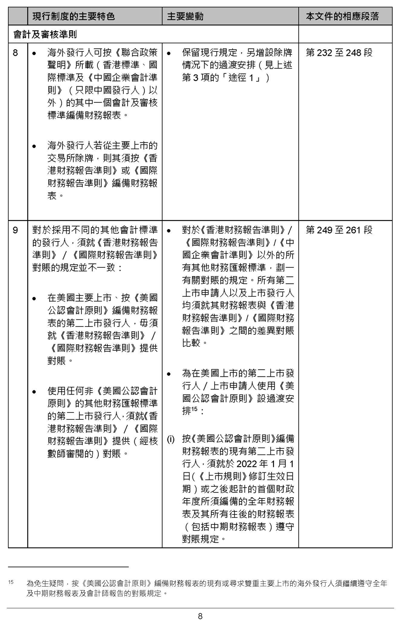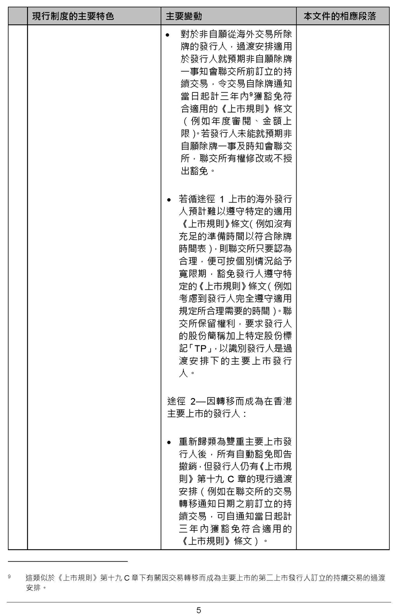 咨詢總結(jié)文件顯示,海外交易所除牌公司,可獲12個月寬限期轉(zhuǎn)用《香港財務(wù)報告準(zhǔn)則》或《國際財務(wù)報告準(zhǔn)則》編寫財務(wù)報表,三年年內(nèi)豁免符合適用的《上市規(guī)則》條文(例如年度審閱、金額上限),而港交所會保留權(quán)利,要求發(fā)行人股份簡稱加上標(biāo)記「TP」。