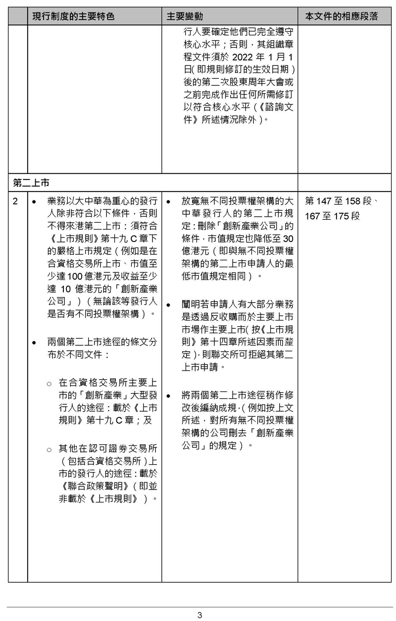沒有不同投票權(quán)架構(gòu)的大中華發(fā)行人可作第二上市,而毋須證明其是“創(chuàng)新產(chǎn)業(yè)公司”,及上市時最低市值將改為30億元港幣(若能證明其在合資格交易所有至少五個完整會計年度的良好合規(guī)紀(jì)錄)或100億元港幣(若能證明其在合資格交易所有至少兩個完整會計年度的良好合規(guī)紀(jì)錄)。