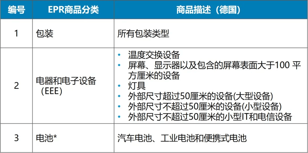 1、德國注冊3個(gè)EPR注冊號:包裝、電器和電子設(shè)備、電池