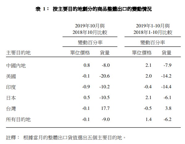 2019年10月商品整體出口價(jià)格同比下跌0.1%。另一方面,商品進(jìn)口價(jià)格則同比上升0.1%。2019年首10個(gè)月與2018年同期比較,商品整體出口價(jià)格上升1.4%。同時(shí),商品進(jìn)口價(jià)格上升1.5%。