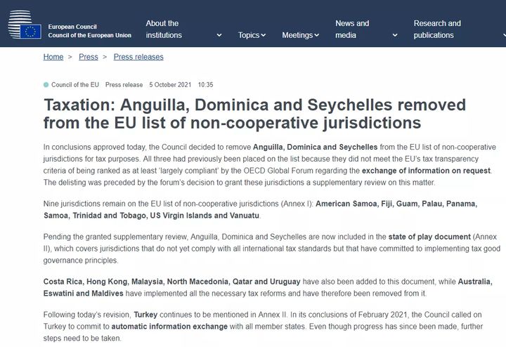 10月5日,歐盟公布了2021年的第二份“稅務不合作司法管轄區(qū)名單”(EU list of non-cooperative jurisdictions for tax purposes,即“黑名單”),宣布將安圭拉、多米尼加和塞舌爾從歐盟不合作名單中刪除。