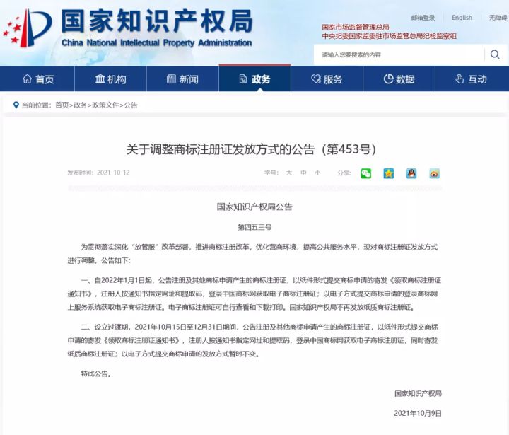 二、設(shè)立過渡期,2021年10月15日至12月31日期間,公告注冊及其他商標(biāo)申請產(chǎn)生的商標(biāo)注冊證,以紙件形式提交商標(biāo)申請的寄發(fā)《領(lǐng)取商標(biāo)注冊證通知書》,注冊人按通知書指定網(wǎng)址和提取碼,登錄中國商標(biāo)網(wǎng)獲取電子商標(biāo)注冊證,同時(shí)寄發(fā)紙質(zhì)商標(biāo)注冊證;以電子方式提交商標(biāo)申請的發(fā)放方式暫時(shí)不變。