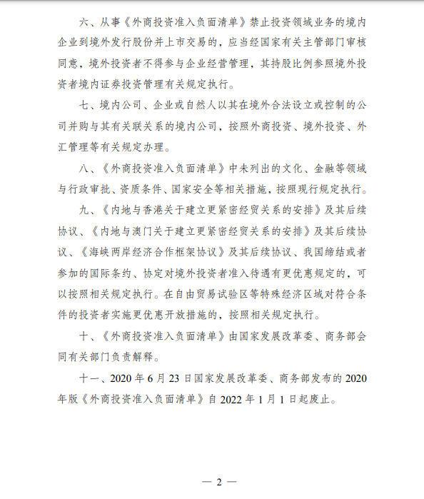 《外商投資準(zhǔn)入特別管理措施(負(fù)面清單)(2021年版)》已經(jīng)在2021年9月18日國家發(fā)展和改革委員會(huì)第18次委務(wù)會(huì)議審議通過和商務(wù)部審簽,并經(jīng)黨中央、國務(wù)院同意,自2022年1月1日起施行。