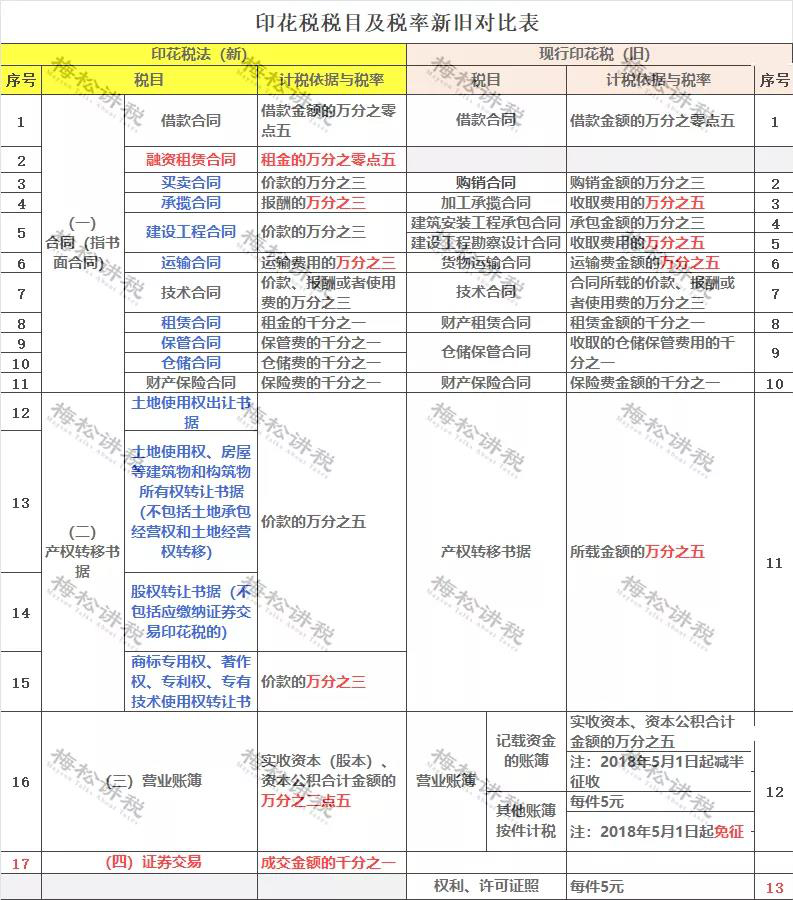 附:印花稅稅目及稅率新舊對比表