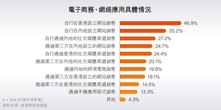 對(duì)于在未來(lái)會(huì)開(kāi)始或維持/更多利用電子商務(wù)、網(wǎng)絡(luò)應(yīng)用的企業(yè),46.9%受訪企業(yè)表示會(huì)自行在香港設(shè)立網(wǎng)站銷(xiāo)售,35.2%表示會(huì)自行在內(nèi)地設(shè)立網(wǎng)站銷(xiāo)售,其他包括自行通過(guò)內(nèi)地的社交媒體渠道銷(xiāo)售(27.2%)、通過(guò)第三方在內(nèi)地設(shè)立的網(wǎng)站銷(xiāo)售(24.7%)、自行通過(guò)香港的社交媒體渠道銷(xiāo)售(24.4%)等。