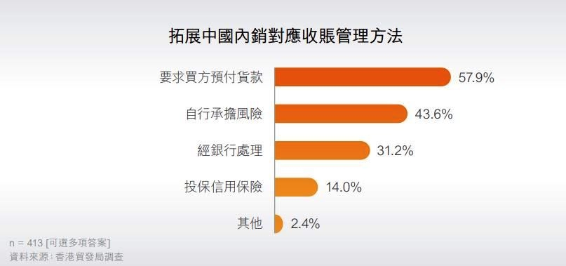 對(duì)于如何妥善管理內(nèi)銷(xiāo)的應(yīng)收賬款,有57.9%受訪企業(yè)表示會(huì)要求買(mǎi)方預(yù)付貨款,43.6%則會(huì)自行承擔(dān)風(fēng)險(xiǎn)。另一方面,31.2%會(huì)經(jīng)銀行處理有關(guān)應(yīng)收賬款,及14.0%會(huì)投保信用保險(xiǎn)。也有小部分(其他:2.4%)表示沒(méi)有或不知道有甚么方法管理應(yīng)收賬。