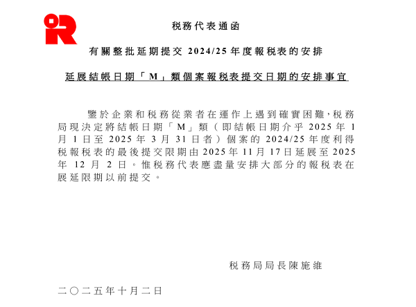香港稅務局于2025年10月2日發(fā)布最新通告,為緩解企業(yè)年底申報壓力,正式延長結(jié)賬日期「M」類公司(即財政年度結(jié)賬日期在2025年1月1日至3月31日之間)的2024/25年度利得稅申報期限——由原定的2025年11月17日延后兩周至2025年12月2日。本次延期旨在為企業(yè)提供更多準備時間,但需注意12月2日為最終截止日,逾期將面臨合規(guī)風險。