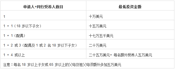 注:1、除了以上投資金額外,主申請人還須支付七千五百美元作為背景審查的費用。如同行的受養(yǎng)人年滿12 歲,亦須支付有關費用。配偶的背景審查費用與主申請人相同,12 至16 歲受養(yǎng)人的背景審查費用為二千美元,16 至25 歲或65 歲以上受養(yǎng)人的背景審查費用為四千美元。