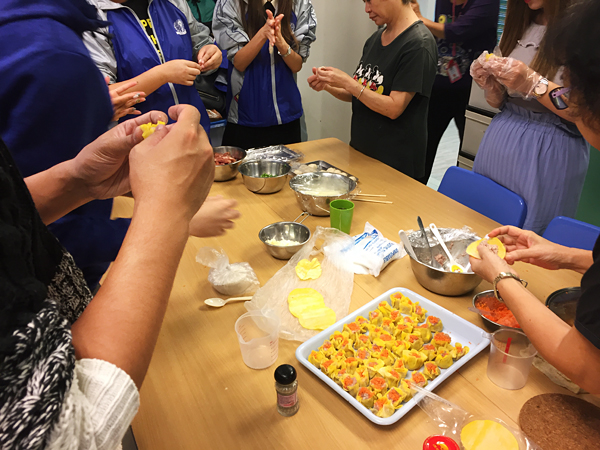 瑞豐義工團(tuán)都馬上動手,聽從導(dǎo)師指示分工,先包燒賣和臘腸卷。