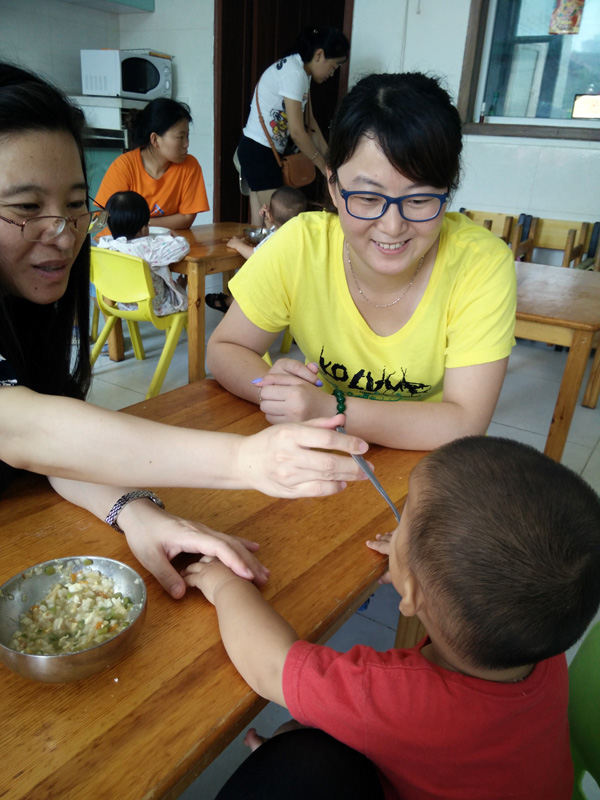 很快到了吃飯的時間,工作人員說這里吃飯是分批的,優(yōu)先給不能獨立吃飯的孩子們喂飯,其次才是能獨立吃飯的孩子。工作人員人手不夠我們自然也加入到了喂飯的隊伍,看著孩子們吃的開心我們的心里也是滿滿的幸福。
