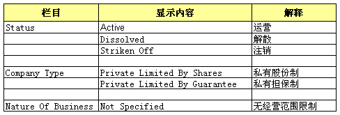 從這個(gè)頁(yè)面上您可以看到公司的名稱和注冊(cè)地址(Name & Registered Office), 公司的注冊(cè)號(hào)碼(Company No.),公司狀態(tài)(Status),成立時(shí)間(Date of Incorporation),公司類型(Company Type),公司營(yíng)業(yè)性質(zhì)(Nature of Business),報(bào)稅日期(Next Accounts Due),年審日期(Next Return Due)。