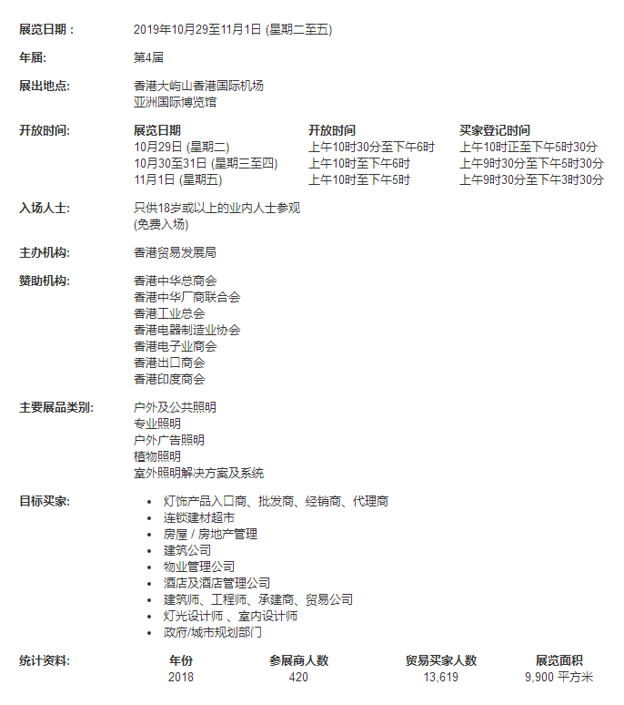 香港貿(mào)發(fā)局香港國(guó)際戶外及科技照明博覽的規(guī)模不斷壯大,足證市場(chǎng)穩(wěn)定健康發(fā)展,為參展商帶來機(jī)遇。由香港貿(mào)發(fā)局主辦的香港貿(mào)發(fā)局香港國(guó)際戶外及科技照明博覽吸引了更多參展商和更多來自不同市場(chǎng)的買家。2018年戶外及科技照明博覽匯聚420家參展商及來自116個(gè)國(guó)家和地區(qū)超過13600名買家。