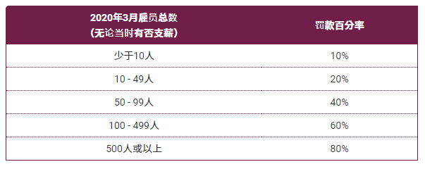 罰款百分率是按雇主于2020年3月的雇員總數(shù)多少(無論當時有否支薪)訂定,即雇員人數(shù)愈多,罰款百分率愈高: