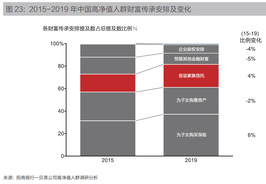 根據(jù)《2019中國私人財富報告》顯示,家族信托在高凈值人士的各類財富傳承安排方式中增長最快,提及率從2015年的16%提升至2019年的20%。可見,家族信托所具備的稅務籌劃、財富保障與傳承功能的優(yōu)勢越來越受到重視。