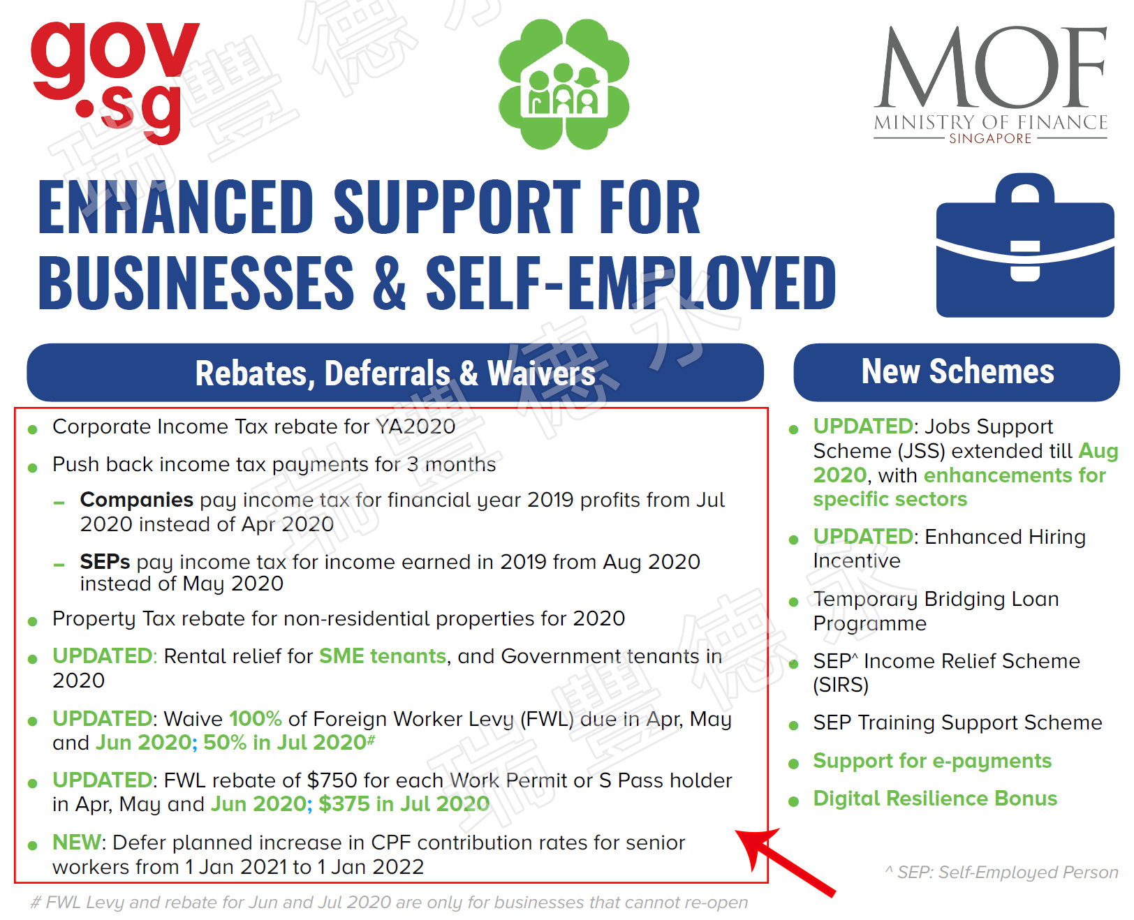 ● 2020年4月~6月,對已獲工作許可證或S pass的外國職工,每人返還750新幣,7月返款375新幣