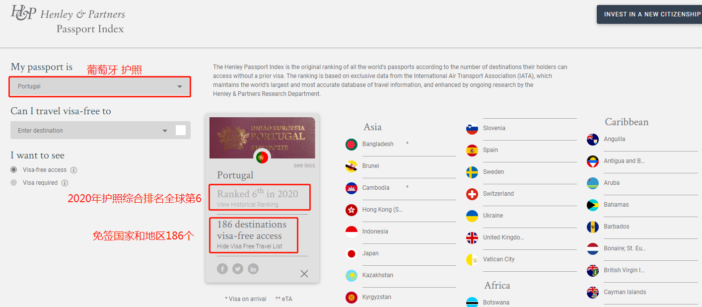 根據(jù)“亨利護(hù)照指數(shù)”顯示,葡萄牙護(hù)照在2020年的全球排名第六,免簽國家和地區(qū)共186個。