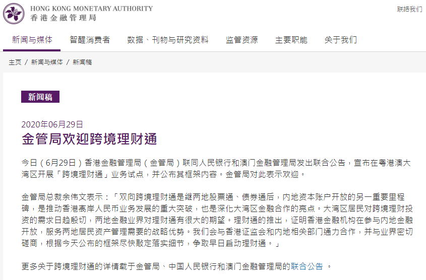 (香港金管局對(duì)跨境理財(cái)通表示歡迎)