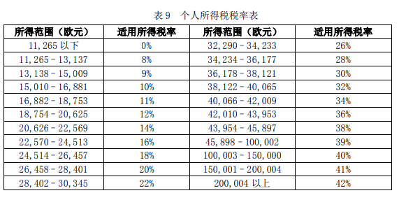 2019年1月1日起,愛(ài)爾蘭個(gè)人所得稅40%收稅比例的起征點(diǎn)從€34550上調(diào)至€35300。年收入在€35300以下的單身人群,只需按照20%的比例繳納個(gè)稅即可(有家庭者稅率更低);年收入超過(guò)€35300,那么超出的部分按照40%的比例繳納個(gè)稅。