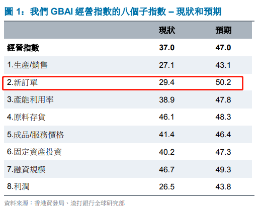 “企業(yè)認(rèn)為第三季度經(jīng)營狀況將顯著改善,且國內(nèi)訂單預(yù)期比出口訂單更好?!毕愀圪Q(mào)發(fā)局研究總監(jiān)關(guān)家明表示,第三季度新訂單預(yù)期大幅改善,從二季度的29.4上升至50.2,超過中性值,說明國內(nèi)外市場復(fù)蘇情況樂觀,在全部8個預(yù)期子指數(shù)中,「新訂單」子指數(shù)相比「現(xiàn)狀」的上升幅度最大。