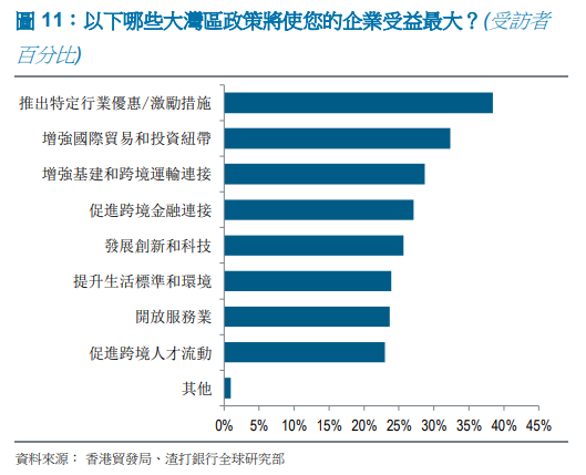接下來的兩個選擇是「鞏固國際貿(mào)易和投資關(guān)系」與「增強(qiáng)基礎(chǔ)設(shè)施和跨境交通運(yùn)輸連通性」,表明港澳、與珠三角之間生產(chǎn)要素中必不可少的金融服務(wù)、與跨境連通性的重要意義。