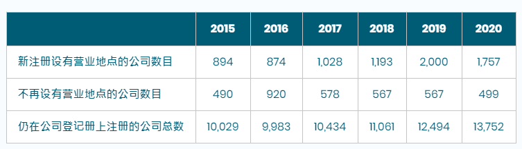 自2014年起,截至2020年年底,根據(jù)《公司條例》注冊(cè)的本地公司總數(shù)達(dá)1,387,919間,較2019年增加了7,734間。
