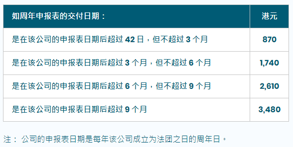 逾期交付周年申報(bào)表的公司,須繳付較高的登記費(fèi)用,相當(dāng)于罰款,根據(jù)不同類型罰款也略有不同,以本地私人公司逾期交付周年申報(bào)表為例,逾期繳付的登記費(fèi)用如下: