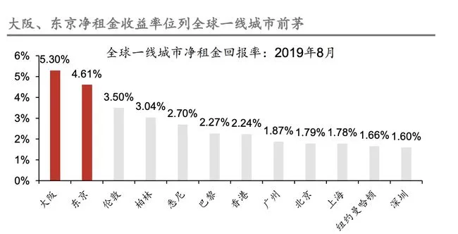 從投資門檻上來看,日本110多萬就可以入手東京地標(biāo)位置的新建酒店;從投資回報率上來看,日本不動產(chǎn)研究院公布的一份2019年8月的數(shù)據(jù)報告顯示,在全球眾多熱門城市中,大阪凈租金收益率以5.30%遙遙領(lǐng)先于其他國際城市,東京排名第二,凈收益可達(dá)4.61%。