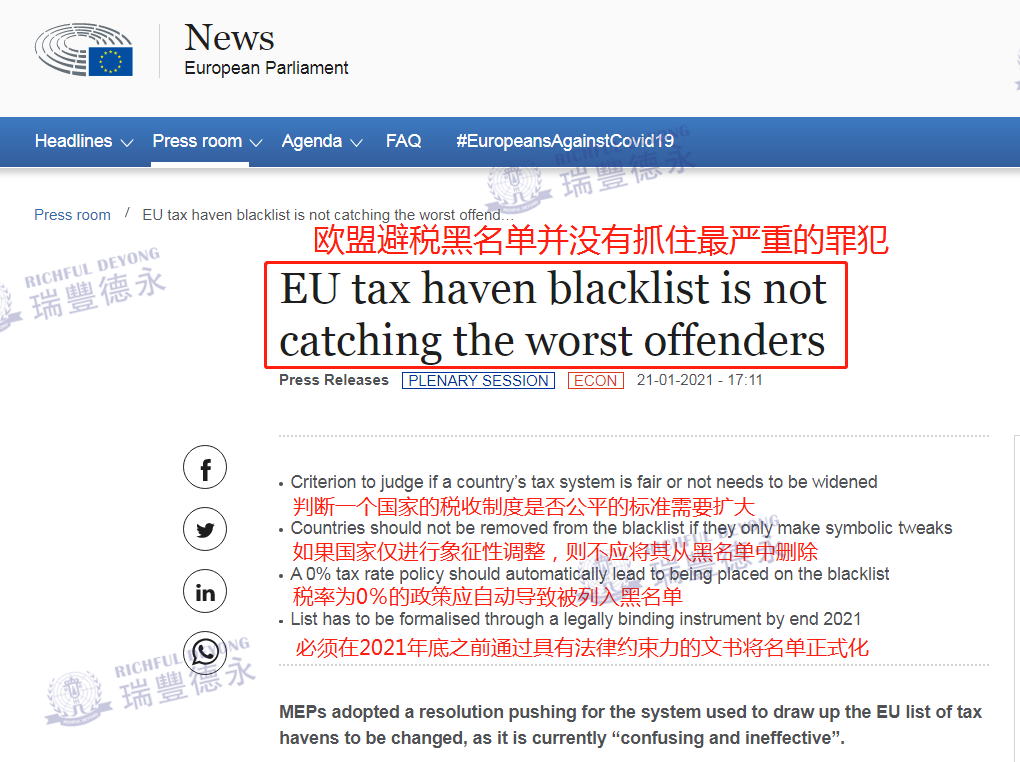 ?? 值得一提的是,在2021年1月21日,歐洲議會(huì)通過(guò)了一項(xiàng)決議,要求理事會(huì)和歐洲委員會(huì)改革歐盟稅收黑名單,并要求更新清單標(biāo)準(zhǔn)和采取更加協(xié)調(diào)一致的防御措施(更多細(xì)節(jié))。