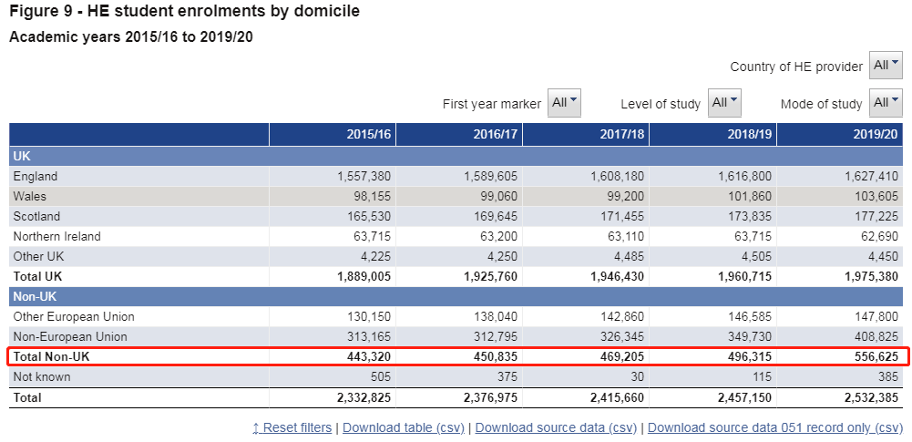 據(jù)HESA數(shù)據(jù)顯示,在2019-2020學(xué)年,英國(guó)各大學(xué)留學(xué)生總數(shù)已超55萬,達(dá)到556,625人,同比上漲12%。
