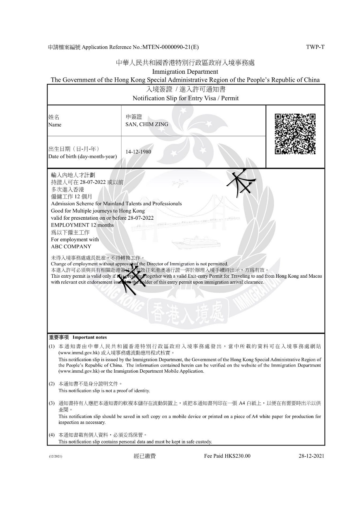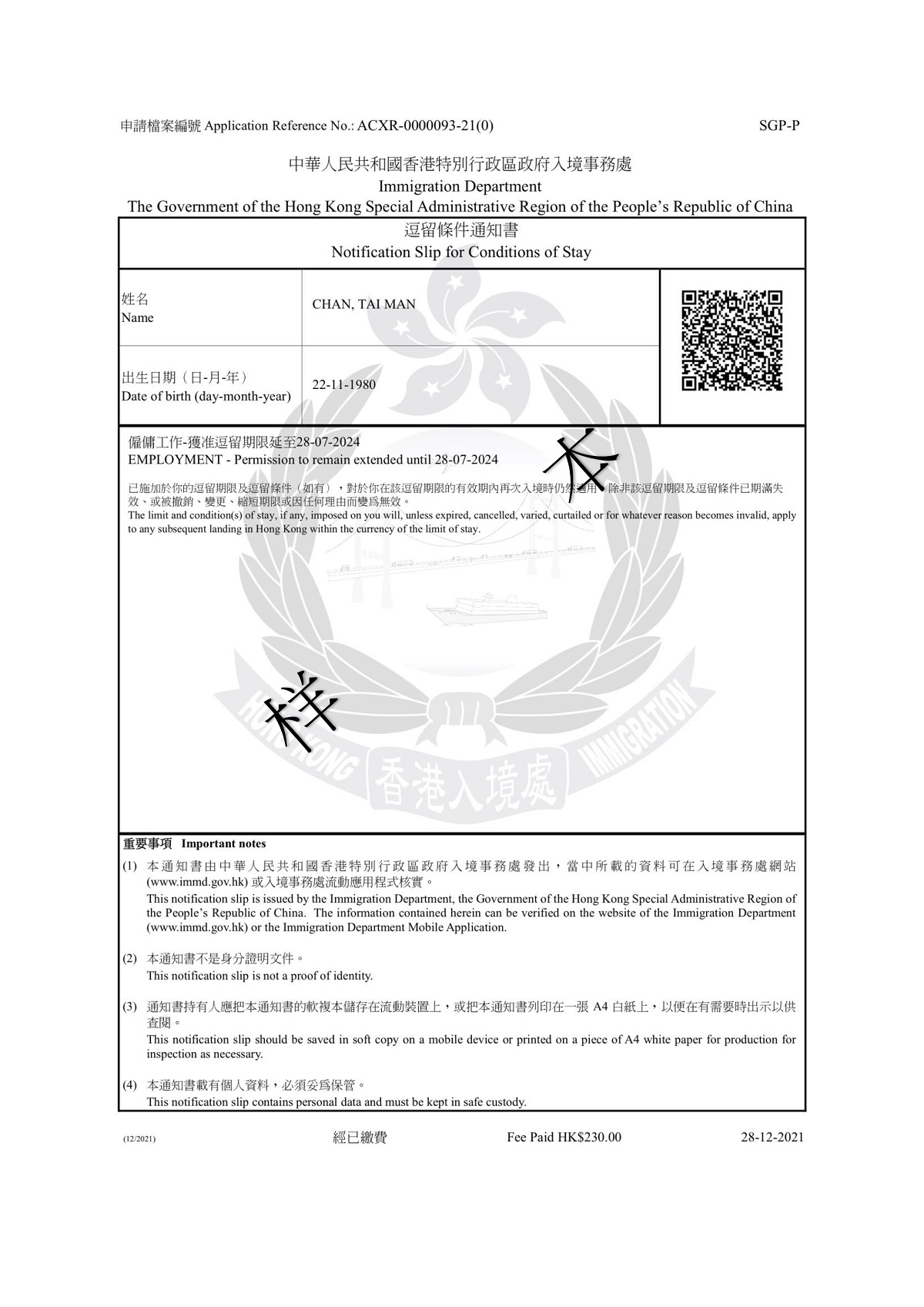「電子簽證」載有加密二維碼供核實(shí)該證之用。有關(guān)人士(例如「電子簽證」持有人的準(zhǔn)雇主)可使用入境處流動(dòng)應(yīng)用程式掃描該二維碼檢視相關(guān)資料。使用其他相機(jī)裝置或流動(dòng)應(yīng)用程式掃描該二維碼將無法檢視相關(guān)資料。此外,有關(guān)人士亦可在香港政府一站通網(wǎng)站或入境處流動(dòng)應(yīng)用程式(APP)輸入「電子簽證」資料,以核實(shí)該證。