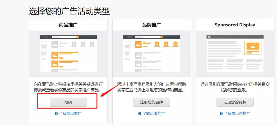 第三步:在新建廣告活動頁面,選擇商品推廣方式底下的【繼續(xù)】,進入新建廣告活動頁面。