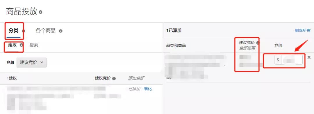 ①分類:在“分類”選項卡中,您可以根據(jù)與商品的相關性投放相應的推薦品類。按照建議競價,設置合理的價格。
