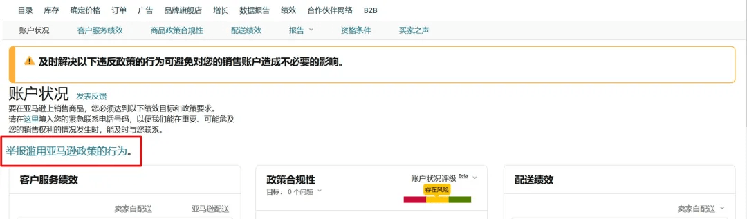 您可以通過(guò)賣家平臺(tái),打開(kāi)“賬戶狀況”,點(diǎn)擊“舉報(bào)濫用亞馬遜政策的行為”進(jìn)行舉報(bào)。