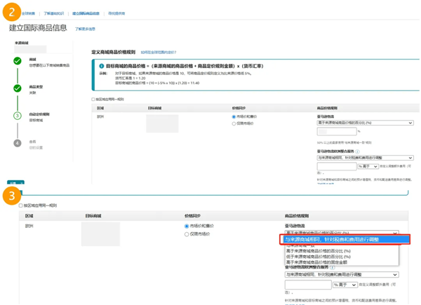 您可以通過:在【建立國際商品信息】頁面右側(cè)的關(guān)聯(lián)設(shè)置 > 點擊定價規(guī)則的【編輯】 > 在下拉菜單中選擇“與來源站點相同,針對稅費和費用進行調(diào)整“來啟用這項自動定價規(guī)則。