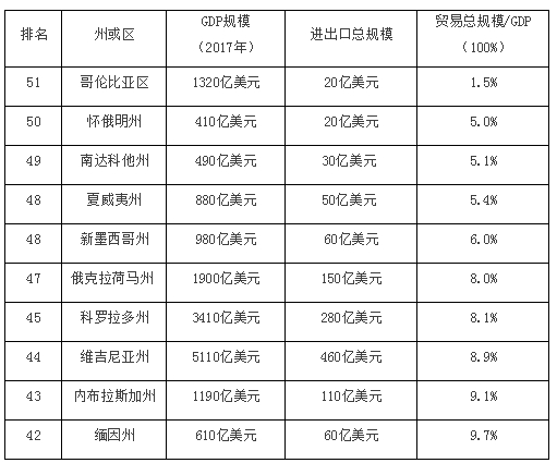 下圖所示為最容易受到美國貿(mào)易戰(zhàn)影響的州。圖中顯示了每個(gè)州的GDP規(guī)模,對(duì)外貿(mào)易規(guī)模以及對(duì)外貿(mào)易在GDP中的占比。